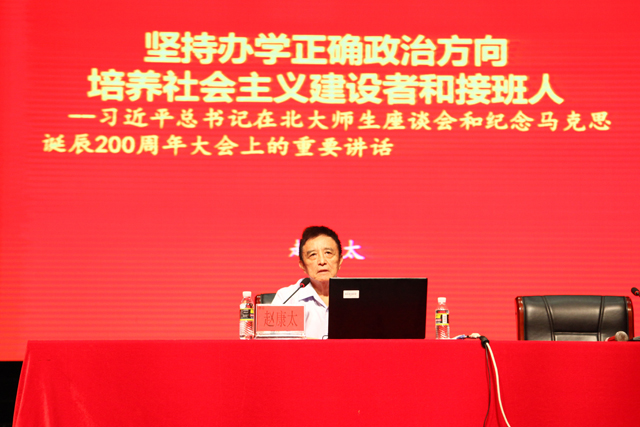 赵康太教授以《坚持办学正确政治方向,培养社会主义建设者和接班人》为题作首场授课。他从“必须坚持以马克思主义为指导”“必须抓住立德树人这个根本任务”“必须建设高素质教师队伍”“必须形成高水平人才培养体系”4个方面全面阐释了如何“坚持办学正确政治方向”,并从其内涵要义、目标要求、形式途径多方面系统地进行了讲解。赵康太表示,高校要明确中国特色社会主义办学方向、办学方针和办学原则,以培养“爱国、励志、求真、力行”青年大学生为己任,培养社会主义合格建设者和接班人。
