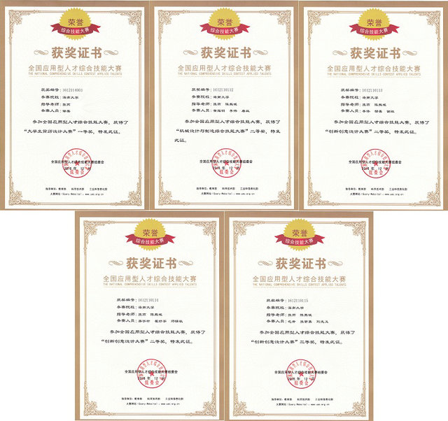 据悉,2016全国应用型人才综合技能大赛由教育部、科学技术部、工业和信息化部指导,教育部高校毕业生就业协会、全国计算机辅助技术认证项目办公室、全国应用型人才培养工程管理办公室主办,是广大学生展示创新、创业水平的重要舞台。比赛从今年5月份开始在全国31个省、自治区、直辖市展开,共有平面设计大赛、创新创意设计大赛、机械设计与制造综合技能大赛、教师创课课件大赛、大学生简历设计大赛、中国青春梦服装创意设计大赛、金蝶云管理创新杯大赛7个比赛科目。来自清华大学、哈尔滨工业大学等近800所高校的7110支队伍参加了比赛,经过层层筛选,最终评选出615个优秀作品进入决赛。海南大学共派出由机电工程学院学生组成的5支代表队闯进决赛并全部获奖。