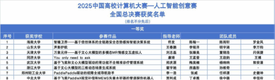 2025中国高校计算机大赛-人工智能创意赛全国总决赛一等奖获奖名单