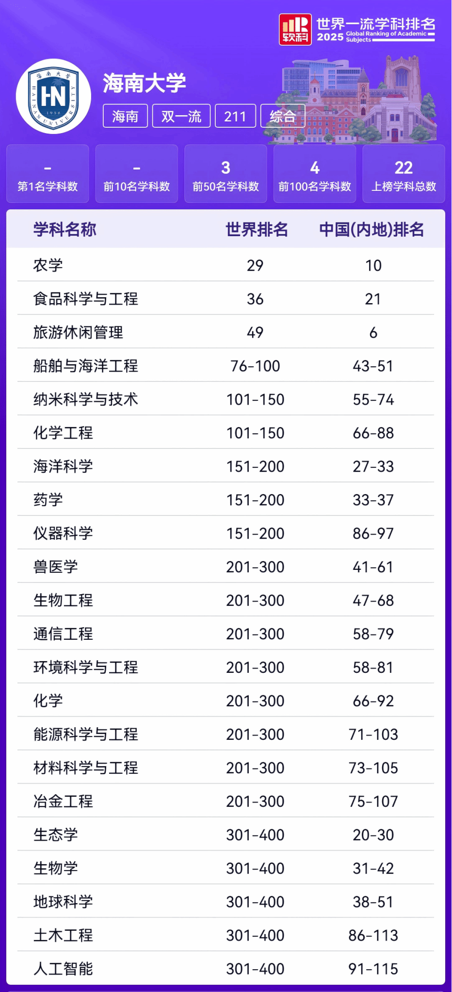 本站讯(记者 王一钦 通讯员 孙旭东)11月18日,高等教育评价专业机构软科正式发布2025“软科世界一流学科排名”。海南大学共有22个学科上榜,总数位列全国53名,较“十四五”初期的5个增长340%;农学、食品科学与工程、旅游休闲管理3个学科成功跻身世界50强,船舶与海洋工程同步挺进世界百强。