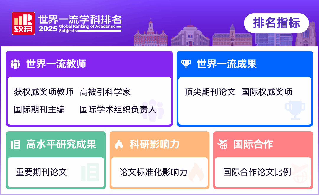 2025软科世界一流学科排名的指标体系包括“世界一流教师”“世界一流成果”“高水平研究成果”“科研影响力”“国际合作”五个模块,下设九项反映学科国际竞争力的客观指标。排名覆盖理学、工学、生命科学、医学和社会科学五大领域。