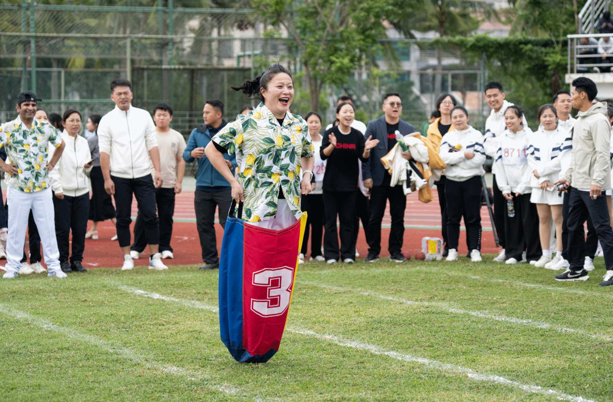 11月19日下午,海南大学第52届田径运动会在海甸校区第一田径运动场开幕。教职工趣味组混合集体袋鼠跳现场。周铭轩 摄