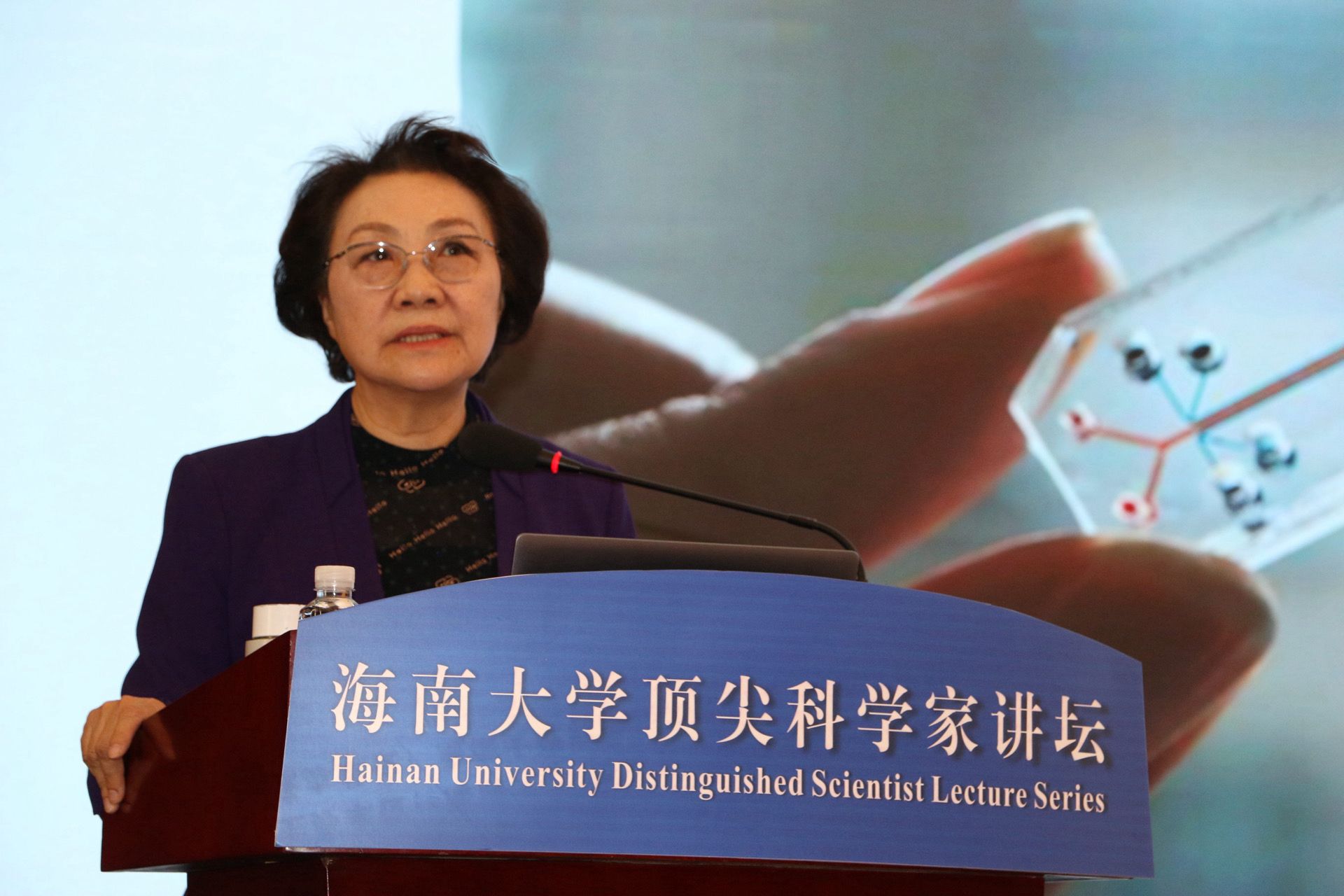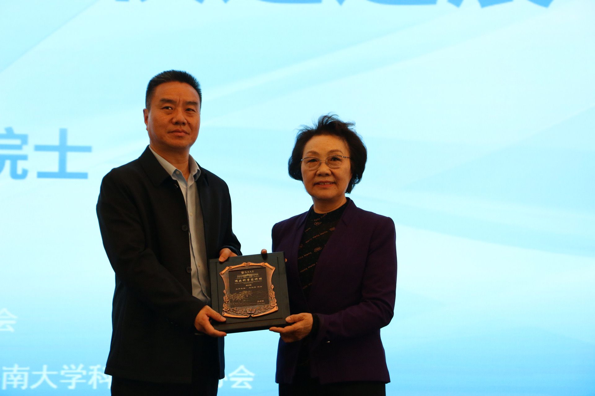 11月28日上午,海南大学第五十期顶尖科学家讲坛在社科楼二楼报告厅举办。贺勇代表学校向王红阳赠送顶尖科学家讲坛纪念牌。吴佳睿摄