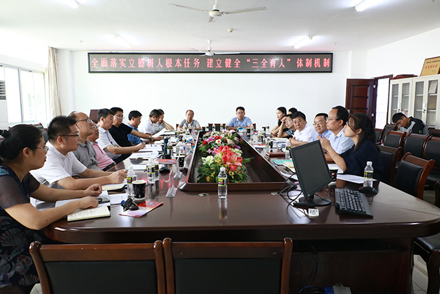 按照《海南大学关于开展“不忘初心、牢记使命”主题教育校党委领导班子成员深入基层调研工作方案》的部署,校党委书记武耀廷率先深入基层开展调研工作。9月26日上午,武耀廷到马克思主义学院调研,并在社科楼A311会议室召开以“全面落实立德树人根本任务,建立健全‘三全育人’体制机制”为主题的调研座谈会,校党委常委、副校长胡新文、王崇敏出席座谈会。