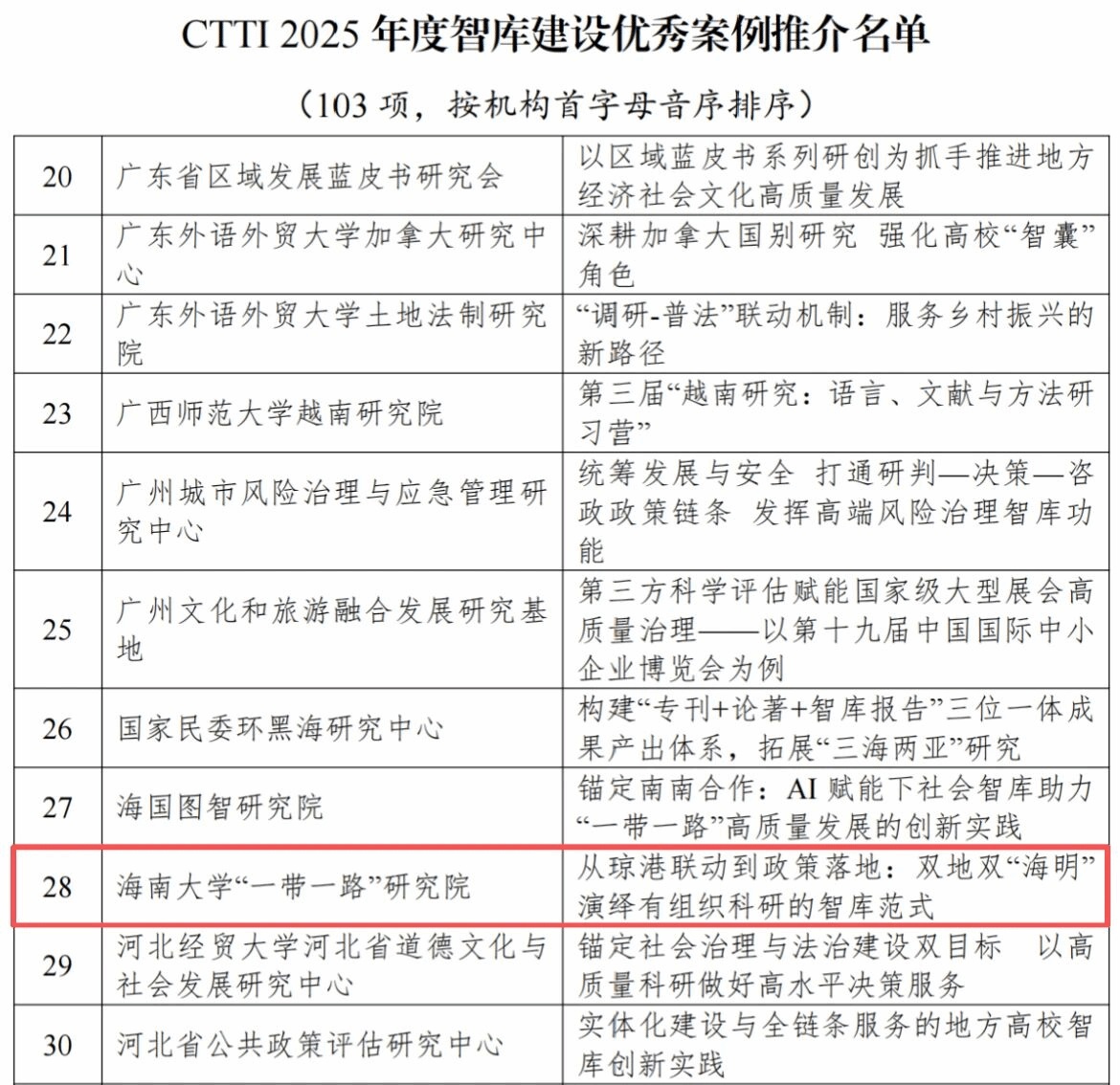 【海南大学】海南大学“一带一路”研究院蝉联CTTI 2025年度全国百强榜A级殊荣