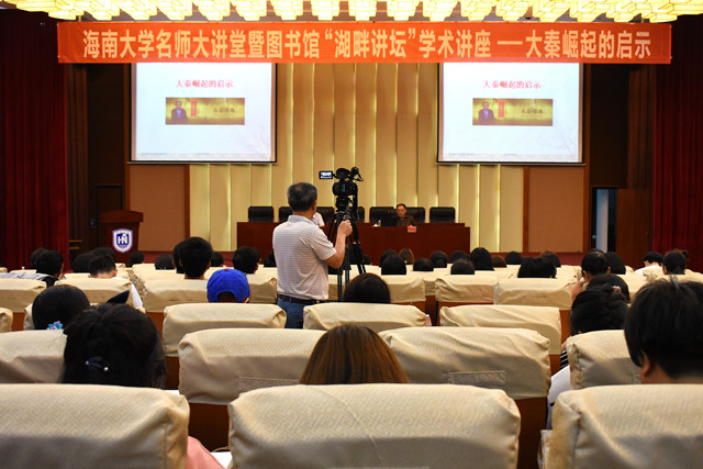 3月30日,海南大学名师大讲堂暨图书馆“湖畔讲坛”学术讲座第101期——《大秦崛起的启示》在社科楼二楼报告厅开讲。本期讲座由华中师范大学教授、现海口经济学院国学研究所所长刘兴林主讲。海南大学副校长胡新文,校党委常委、宣传部部长谭勇出席讲座。讲座由胡新文主持。