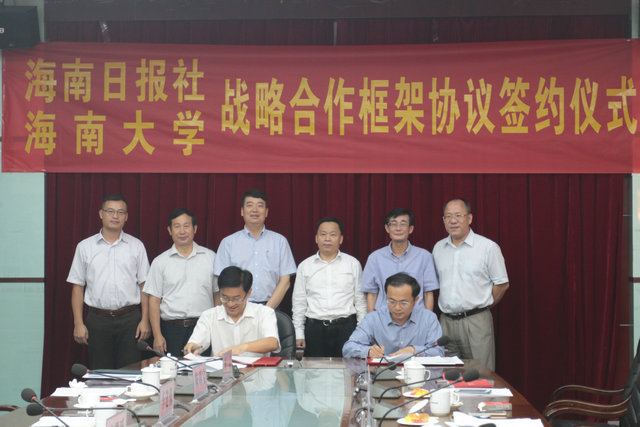 10月31日下午,海南大学和海南日报社战略合作框架协议签订仪式在海南日报社举行。省委宣传部副部长、海南日报报业集团党委委员、副总编辑郭志民,集团副社长、总经理翁朝健,海南大学党委书记武耀廷、校长李建保、党委常务副书记廖清林出席签约仪式。