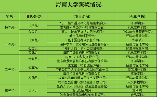 5月20日,由共青团海南省委、海南省教育厅、海南省人力资源和社会保障厅、海南省工业和信息化厅、海南省科学技术协会以及海南省学生联合会共同主办,海南大学、海南酷秀投资控股有限公司和阿里云创客+孵化器联合承办的“FIND校园合伙人”2016年“创青春”海南省大学生创业大赛暨“挑战杯—彩虹人生”海南省职业学校创新创效创业大赛决赛在思源学堂大礼堂落下帷幕。海南大学参赛队伍表现出色,再创佳绩,共获得特等奖3项,包揽一等奖5项,获得二等奖7项,三等奖3项。
