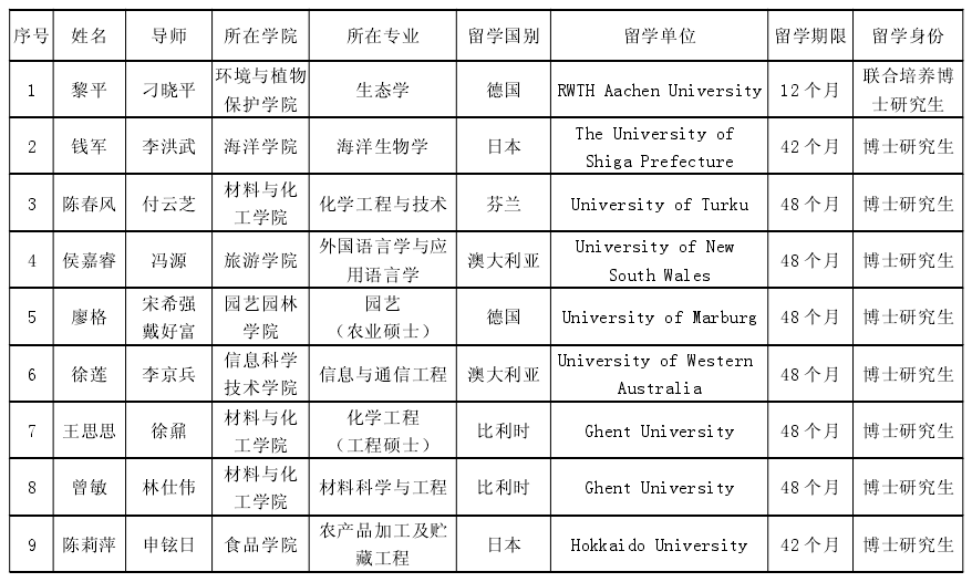 日前,国家留学基金管理委员会下发了2016国家建设高水平大学公派研究生项目录取结果,我校9名同学榜上有名,其中8名同学被录取为攻读博士学位研究生,1名同学被录取为联合培养博士研究生。我校今年获得留学基金委资助人数较去年增加2人,再次实现了新的突破。