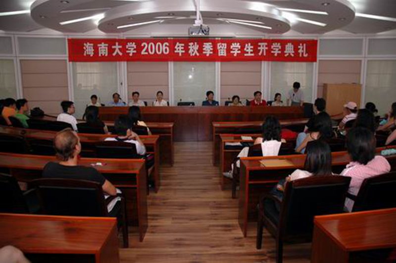 9月8日上午,“海南大学2006年秋季留学生开学典礼”在我校行政办公楼一楼报告厅隆重举行。出席开学典礼仪式的领导和嘉宾有:校党委书记赵康太教授、前副校长符华儿研究员、海南华晔项目策划(服务)有限公司董事长兼总经理、华明海外教育顾问公司董事长、中美高等教育顾问中国区业务首席顾问王润华女士、外事侨务处华世佳处长、教务处处长程立生教授、后勤服务集团副总经理许成强先生。国际文化交流学院主持全面工作的副院长李渝凤博士以及学院全体教职工、已报到的全体外国留学生参加了开学典礼。开学典礼仪式由国际文化交流学院办公室主任贾绍东副教授主持。