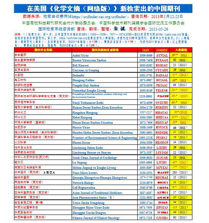 由中国高校科技期刊研究会对外联络委员会、中国科学技术期刊编辑学会国际交流工作委员会国际检索系统咨询部查询、翻译、整理,《海南大学学报:自然科学版》2011年被美国《化学文摘(网络版)》检索,入库篇数为32篇。