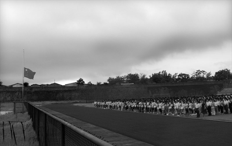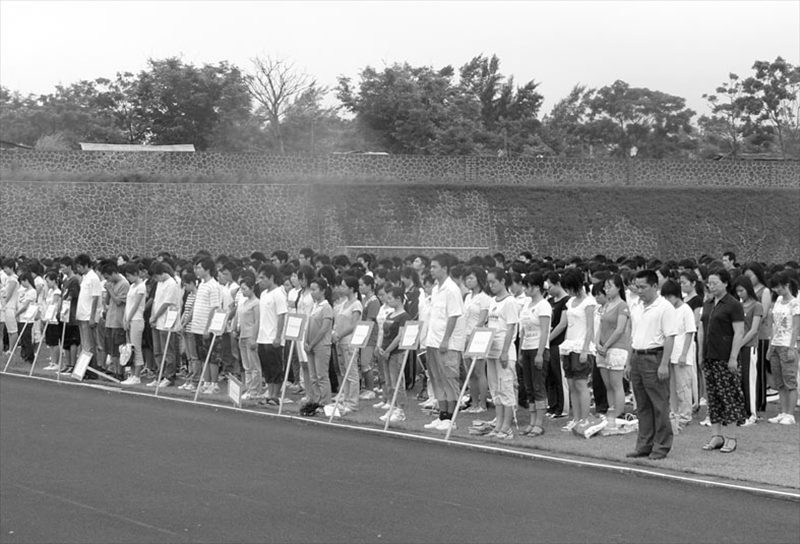 本网讯(陈彪)5月19日下午14时28分,海口市乌云密布,天空飘起了小雨,应用科技学院全体师生在该院体育运动场上整齐地排成数列,为在一周前汶川地震中不幸遇难的人们默哀。