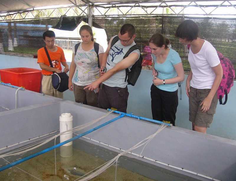考察期间,英国学生参观了我省的部分海水鱼类、珍珠贝、对虾、东风螺、鲍鱼育苗场和养殖场,参观了东寨港红树林国家自然保护区以及海口市的海鲜市场,深入了解了我省的海水养殖和红树林保护现状。英国学生还与海洋学院的研究生进行了生活和学习方面的交流,增进了彼此间的友谊。
