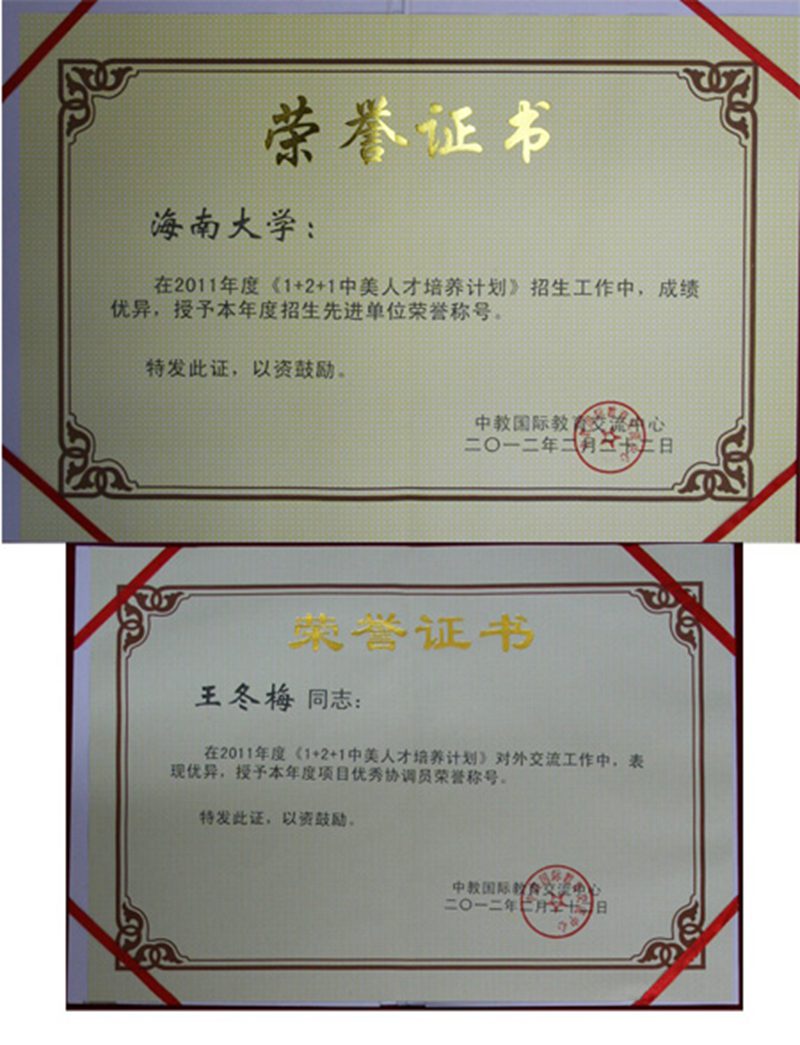 近日,在北京召开的教育部中国教育国际交流协会中教国际教育交流中心《1+2+1中美人才培养计划》年度工作会议上,我校荣获2011年度《1+2+1中美人才培养计划》先进工作单位称号,我校教务处王冬梅老师被评为2011年度项目优秀协调员。