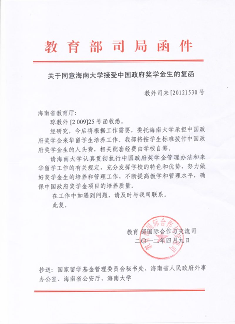 近日,从教育部国际合作与交流司下发的《关于同意海南大学接受中国政府奖学金生的复函》中获悉,我校成为海南省首家接收中国政府奖学金来华留学生资格的高校,填补了海南省无中国政府奖学金来华留学生资格高校的空白。