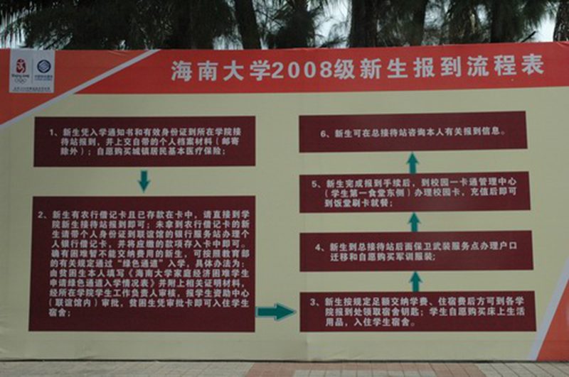2008年9月5日是海南大学08级新生正式报到的第一天,经过各部门、各学院及学生党员、志愿者多天来紧锣密鼓的筹备,海甸校区迎新工作已于今天早上全面展开。
