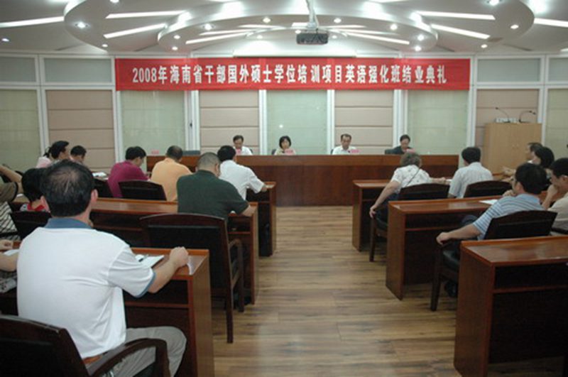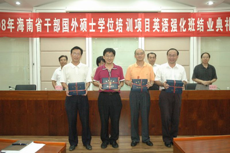 2008年9月29日,2008年海南省干部国外硕士学位培训项目英语强化班结业典礼在我校办公楼一楼报告厅隆重举行,海南省委组织部部务委员郝玉群、组织部培训处处长陈才华、副处长栗太强参加了结业典礼,我校参加结业典礼的领导有校党委常务副书记刘康德、副校长严庆、副校长周兆德,以及全体任课教师和有关部门领导,大会由副校长周兆德主持。