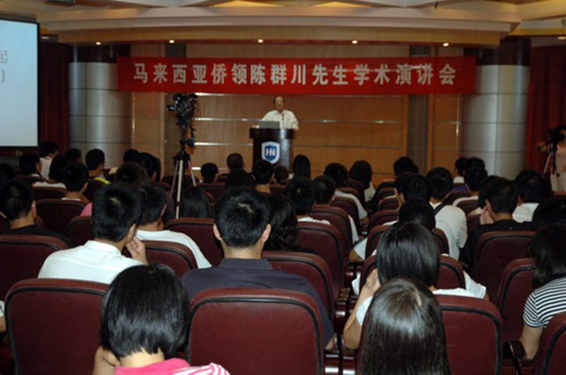 下午三点,严庆副校长主持了学术演讲会。他代表海南大学全体师生员工向陈群川先生表示热烈欢迎,他简要介绍了陈先生的传奇成长经历和其为改善马来西亚华人政治经济地位所做的卓越贡献,他还对陈先生作为原海南大学第一届和第二届理事会副理事长为海南大学建设和发展做出的重大贡献表示衷心感谢。