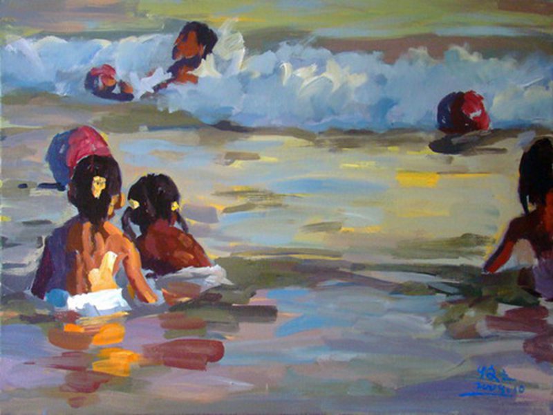 牧之教授创作的油画作品《女儿.三亚的海》,以海南最具吸引力的阳光、沙滩与海滩嬉戏的儿童形象为主题。人与自然亲密和谐,画面色彩热情洋溢、激情四射,充满了流曳的色彩和甜美的抒情笔触;画面造型明丽写实、人物情绪饱满充沛,充分展示了我们海南得天独厚的自然面貌和人文特征。