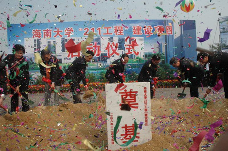 12月15日上午,海南大学“211工程”建设基建项目奠基仪式在第四教学楼工地隆重举行。教育部部长周济,海南省委书记卫留成和其他省、部领导以及海南大学党委书记黄国泰,校长李建保参加了本次奠基仪式。各位领导和嘉宾为奠基石培土,现场礼花齐放,一片喜庆景象。在鞭炮和欢快的乐曲声中,奠基仪式圆满结束。