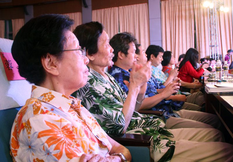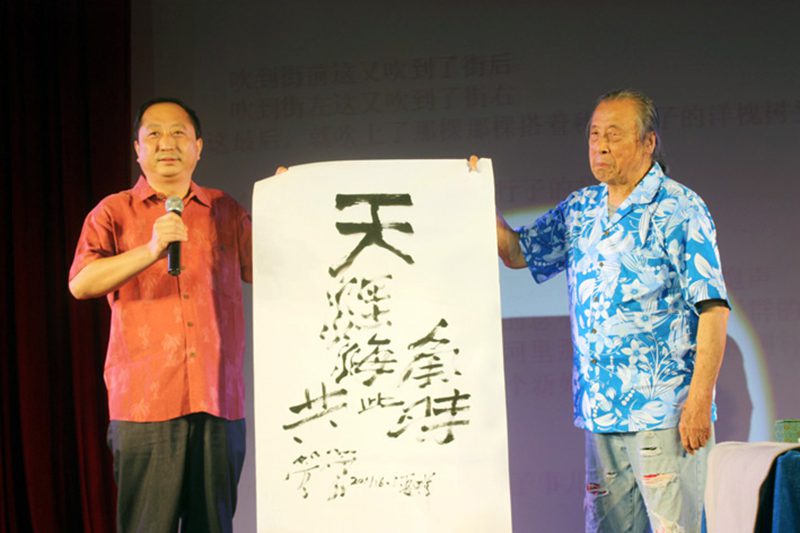 整场开幕式暨诗歌朗诵会高潮迭起,掌声不断。精彩纷呈的诗歌朗诵会分为四个章节。在第一章节“爱与情”中,荣子的《一朵青莲》和潘维的《梅花酒》等著名诗篇歌颂了美好的爱情。诗人蓉子和罗门牵手半个世纪的相濡以沫,更是感动了现场每一位观众。罗门老师说,是善良的蓉子老师让他发现了生活中的美,也是这种美的力量带领他们走过了近一甲子的岁月。在第二章节“我们的生活”里,诗人朗诵了《宅女的房间》、《坐着》等诗篇。这些诗通过对生活中平常琐事的描述,表达了对生命、对自然的反思,影射了一种社会现状,教会了我们一种处世哲学。第三章节“自然与美”,《春歌》、《在秋天》等作品细腻地描绘了自然的美景与柔美的思绪。其中,管管老师激情四射、不拘一格的“演诗”形式让观众惊叹不已:原来优美的现代诗还可以这么朗诵!管管老师还即席挥毫,刘耿副主任代表省台办接受了墨宝。第四章节为“传统与现代”,远岸的《做一个有关鱼的梦》和方明的《离骚篇》、《地铁神话》,与由陈海波副主任作词的歌曲《儋州风华》交相辉映,体现了传统与现代的完美结合。