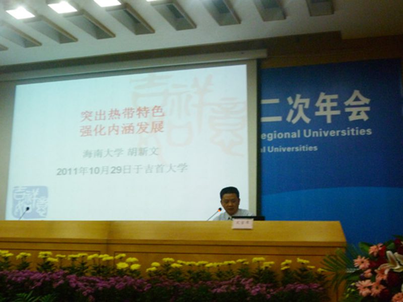 会议期间,来自苏州大学、西北大学、湘潭大学、海南大学等12所高校的代表分别作了主题发言。胡新文副校长作了《突出热带特色 强化内涵发展》的主题报告。着重从体制机制改革、夯实科研基础、创新办学特色、强化内涵建设及服务地方经济社会发展等方面介绍了我校服务地方经济社会发展方面所做的努力,以及对当前我国高等教育发展改革的思考与实践。