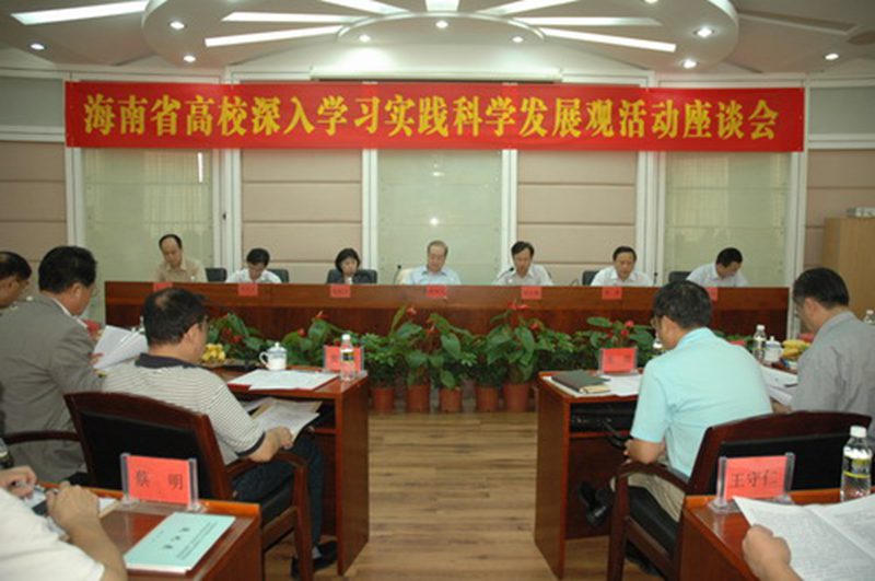 4月24日上午,海南省高校深入学习实践科学发展观活动座谈会在我校召开。中央学习实践活动第四巡回检查组组长、全国政协常委、人口资源环境委员会主任、国家人口和计划生育委员会原主任、党组书记张维庆,中央学习实践活动第四巡回检查组成员、中组部干部教育局副巡视员程桂兰,中央学习实践活动第四巡回检查组成员、福建省泉州市团委副书记黄天凯,中央学习实践活动第四巡回检查组成员、江西财经大学党委宣传部副部长喻春龙,中央学习实践活动第四巡回检查组成员、张维庆同志秘书张晖,省委学习实践活动领导小组办公室副主任兼高校指导协调组组长、省教育工委常务副书记、教育厅厅长胡光辉,省委学习实践活动领导小组办公室副主任、省委组织部部务委员梁粟,省委学习实践活动领导小组办公室高校指导协调组副组长、省教育工委专职副书记、纪工委书记麦浪出席座谈会,胡光辉主持会议。