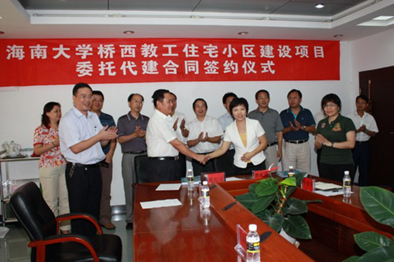 7月24日上午,海南大学桥西教工住宅小区建设项目委托代建合同签约仪式在办公楼四楼会议室举行。我校曹献坤副校长和山东建大教育置业有限公司周纪元总经理代表双方在合同上签字。