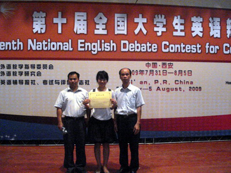 经过激烈竞争,我校选手获得优异的成绩,其中武慧娇同学获得第三届全国大学生英语风采大赛二等奖、第十届全国大学生英语演讲赛三等奖、第十届全国大学生英语辩论赛三等奖;胡志兵同学获第十届全国大学生英语辩论赛二等奖和第十届全国大学生英语演讲赛优秀奖,展示了新海南大学大学生的英语水平和精神风貌,为学校争光。