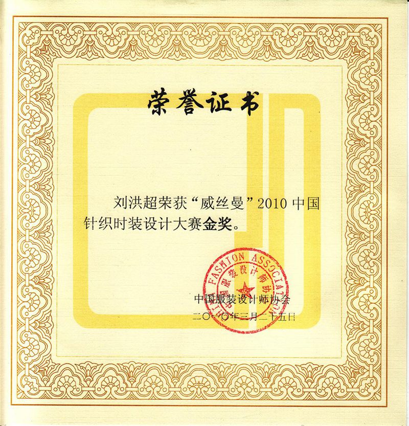 “威丝曼”2010中国针织时装设计大赛是由中国服装设计师协会,珠海威丝曼服饰有限公司主办,中国时尚毛衫研发基地、《服装设计师》杂志社、《中国纺织》杂志社协办的中国针织时装设计权威赛事。大赛于2009年3月启动,共收到来自全国26个地区的1211份参赛作品。经过评委的严格评定,来自中国内地和香港等14个地区的23位选手入围决赛。本次大赛组委会邀请了中国十佳设计师金鼎奖获得者武学伟先生、中国十佳设计师李小燕女士、中国十佳设计师邓皓女士、中国十佳设计师施杰先生、台湾服装设计师潘怡良女士、日本服装设计师本间游先生、等国内外职业时装设计师及专家担任评审工作,最终评出金奖1名、银奖2名和铜奖2名。我校学生刘洪超凭借作品《曲水流裳》在众多服装院校及职业设计师选手中脱颖而出获得金奖。