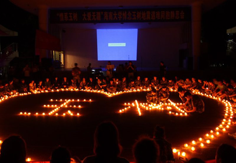 21日晚十点,“情系玉树,大爱无疆”,海南大学悼念玉树地震遇难同胞静思会在海甸校区第一田径场举行。主席台前蜡烛围成的大大的心形,烛光闪闪,像一双双含泪的眼睛,上千名同学围坐在心形旁边,来自青海的学生被围坐在心形里面。