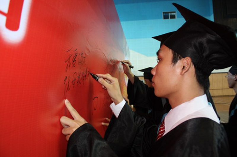 毕业生在许愿墙上写下自己对母校的美好祝愿