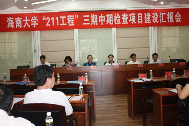 “211工程”重点学科建设项目负责人胡新文教授、陈国华教授、曹阳教授、杜文才教授、王崇敏教授、闫广林教授分别汇报了《热带作物遗传育种与生态保育》、《热带海洋经济动物的繁育和海洋生物利用》、《热带特有优势资源开发和加工新技术》、《海洋通信与信息岛建设》、《海南特区体制机制创新研究》、《海南历史文化和黎族研究》六个重点学科建设项目的情况;研究生处处长张银东、人事处处长刘雯分别汇报了《创新人才培养》和《队伍建设项目》的情况;网络与教育技术中心主任周文山、图书馆馆长詹长智、国资处副处长谭垂谓、教务处副处长曲涛分别汇报了《数字化校园建设》、《数字化图书馆》、《热带农学教学实践基地》、《公共实验教学平台》等校内公共服务体系建设项目情况;基建处处长李艳荣汇报了《基础设施建设》情况。特邀专家张本教授、谭兵教授等针对项目建设以及开展情况提出了宝贵的意见与建议,各项目建设负责人表示将进一步完善项目的各个环节,在今后一年半的建设过程中严格按照项目评估要求实施,顺利通过国家“211工程”的评估与验收。