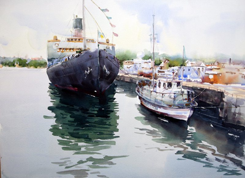 王家儒教授创作的《出海之前》,笔法轻松潇洒、色彩强烈、用明快的色调去描绘海南西部渔港的火热生活场面,构思新颖、具有南方地域特色。吴兴亮教授创作的《船》,用笔奔放,挥洒自如,水色交融,淋漓酣畅。画面风格简约质朴,水分淋漓又不失于轻浮,在水色之中见神韵,充分发扬了水彩画的特长。