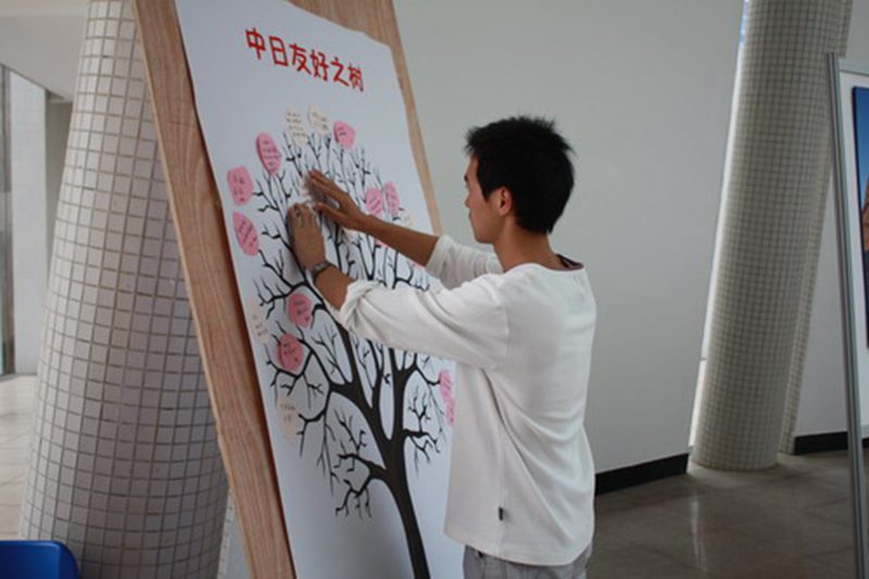 在展示现场,中日交流友谊之树上贴满了写着祝福语的卡片。来自旅游学院的谢同学写下了自己的祝福语“祝中日友谊长存,齐心协力,共同发展”,她表示,曾经不太认同日本及日本文化,通过这次图片展,她意识到了齐心协力共同发展的重要性,希望中日友谊能够长存。日本国际协力机构驻中国事务所所长助理倉科和子说:“从1979年起,机构开始对中国进行援助。希望通过这次活动,可以让更多的大学生,更多的中国人理解机构的活动,加强中日友好!”