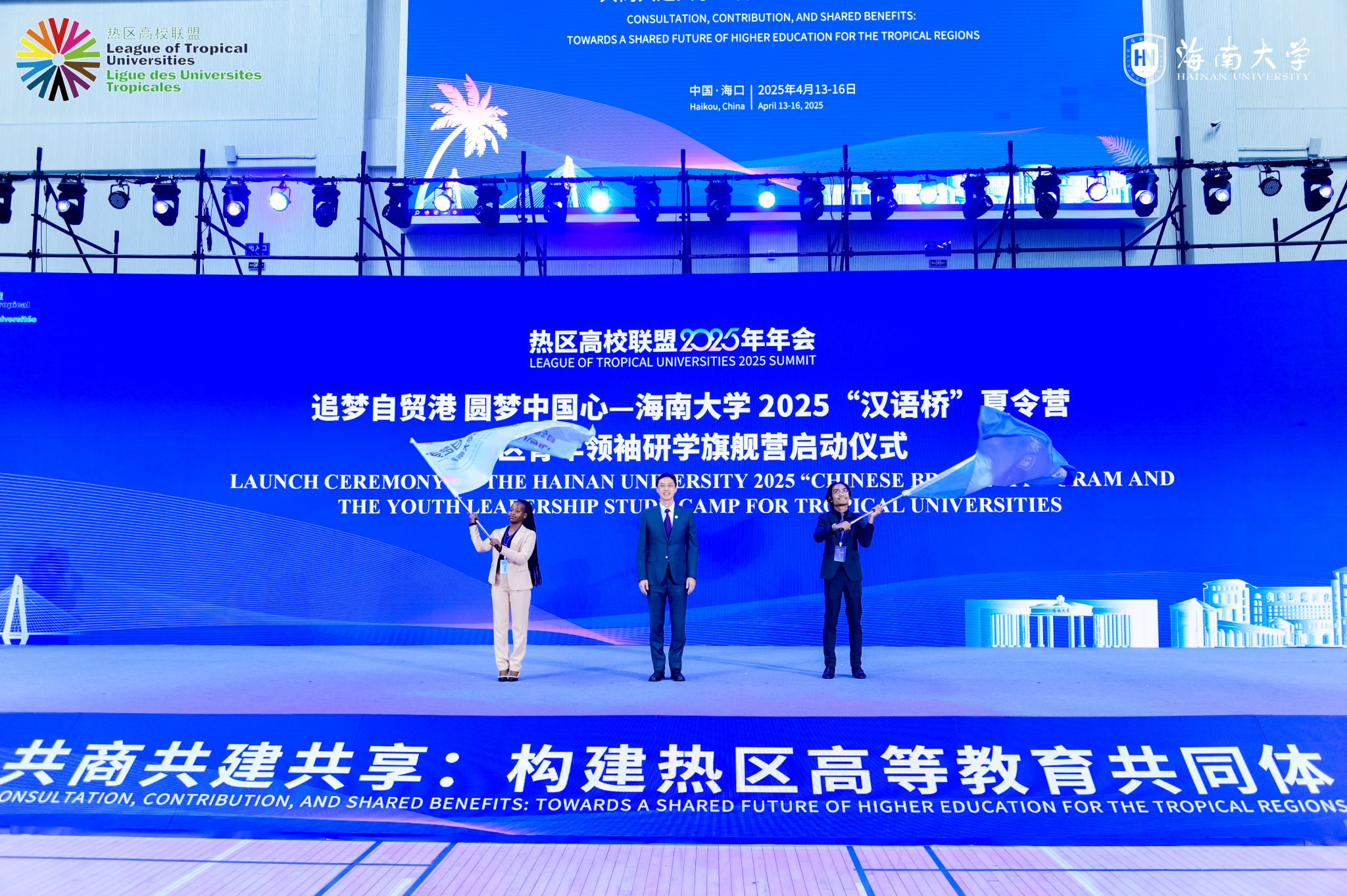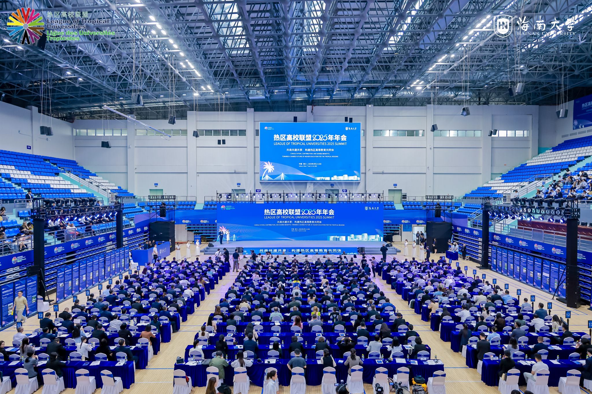 4月14日上午,热区高校联盟2025年年会在海南大学体育馆开幕。这是追梦自贸港 圆梦中国心——海南大学2025“汉语桥”夏令营及热区青年领袖研学旗舰营启动仪式现场。宣传部 摄