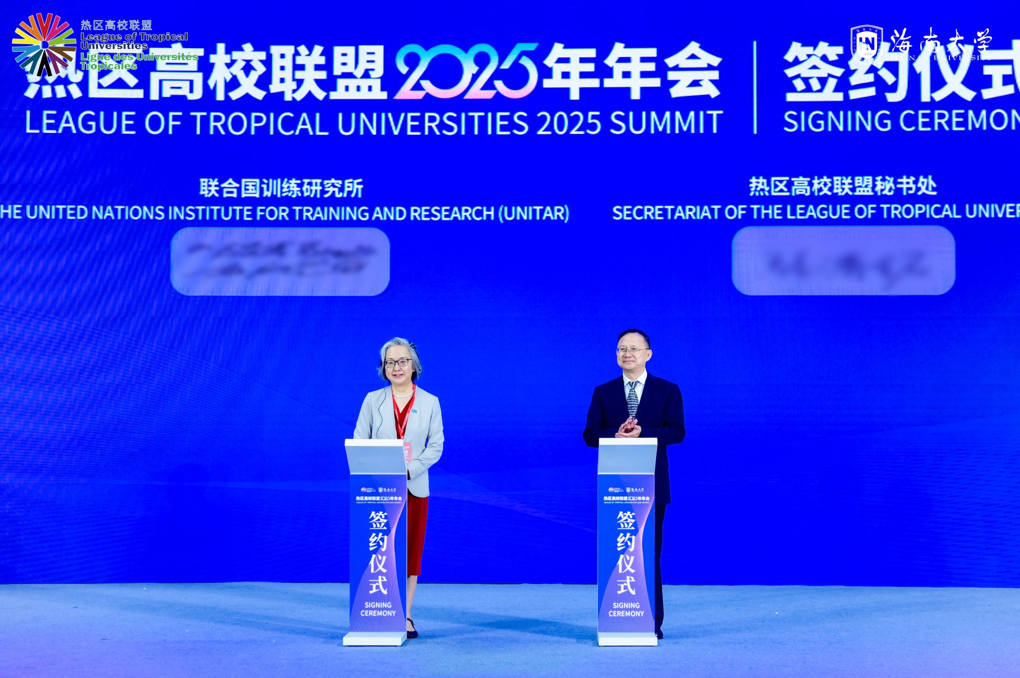 4月14日上午,热区高校联盟2025年年会在海南大学体育馆开幕。这是隈元美穂子与骆清铭签署《合作备忘录》。宣传部 摄
