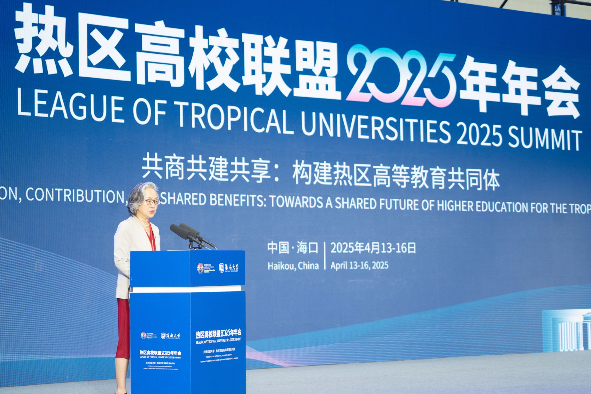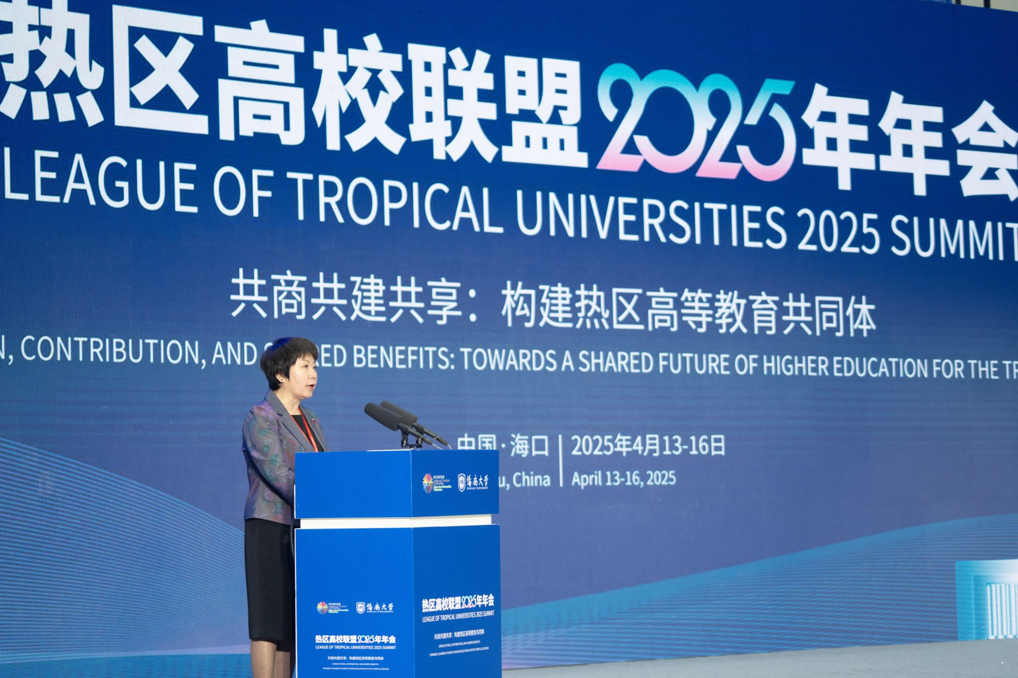 4月14日上午,热区高校联盟2025年年会在海南大学体育馆开幕。这是隈元美穂子致辞。宣传部 摄