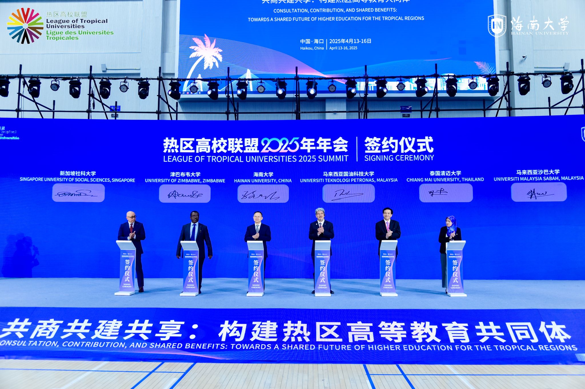 4月14日上午,热区高校联盟2025年年会在海南大学体育馆开幕。这是穆罕默德·易卜拉欣·阿卜杜勒·慕达立、保罗•马弗莫、查林•特查蓬、叶敏盛、郑慧慧与骆清铭签署合作协议。宣传部 摄