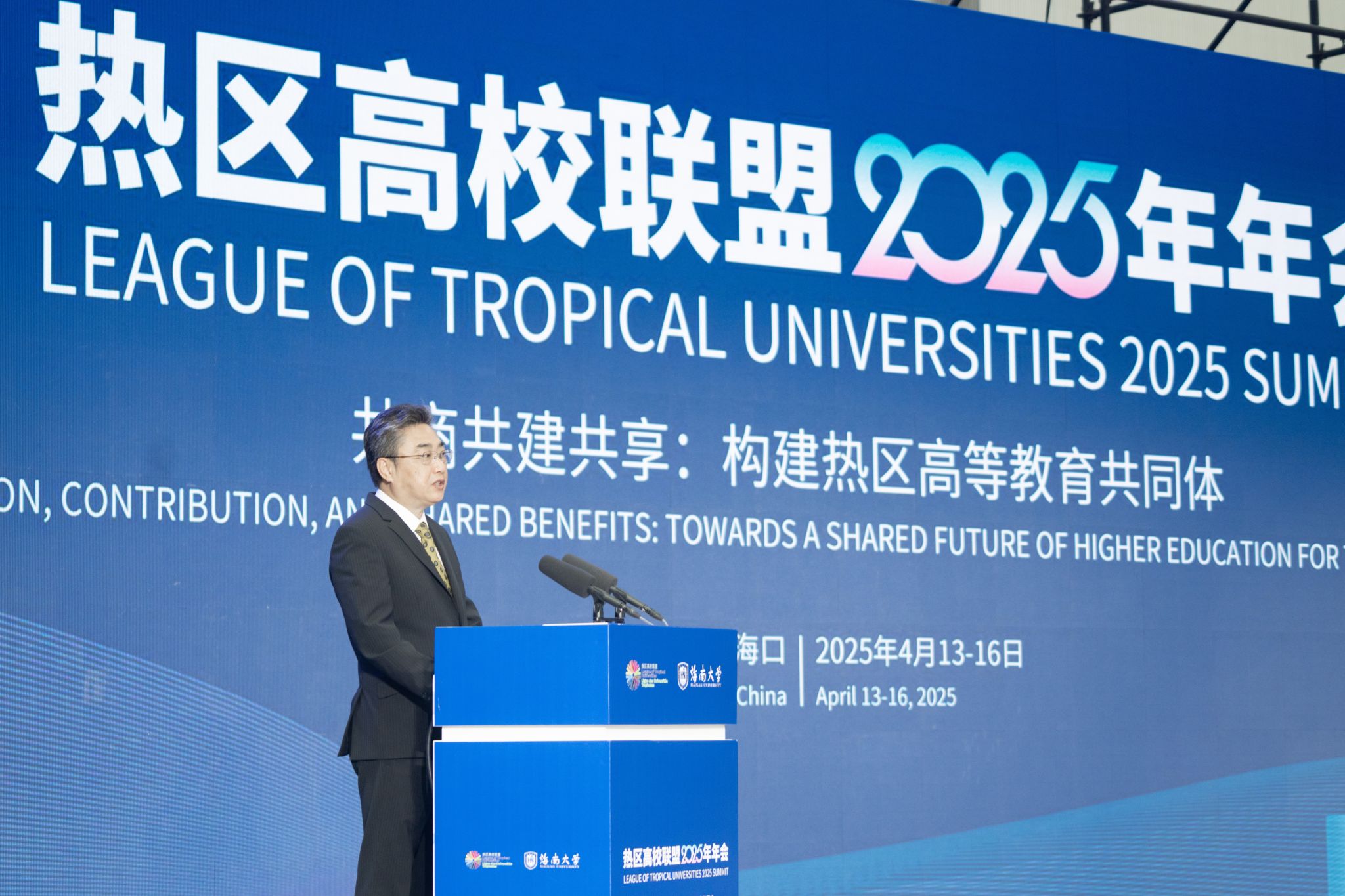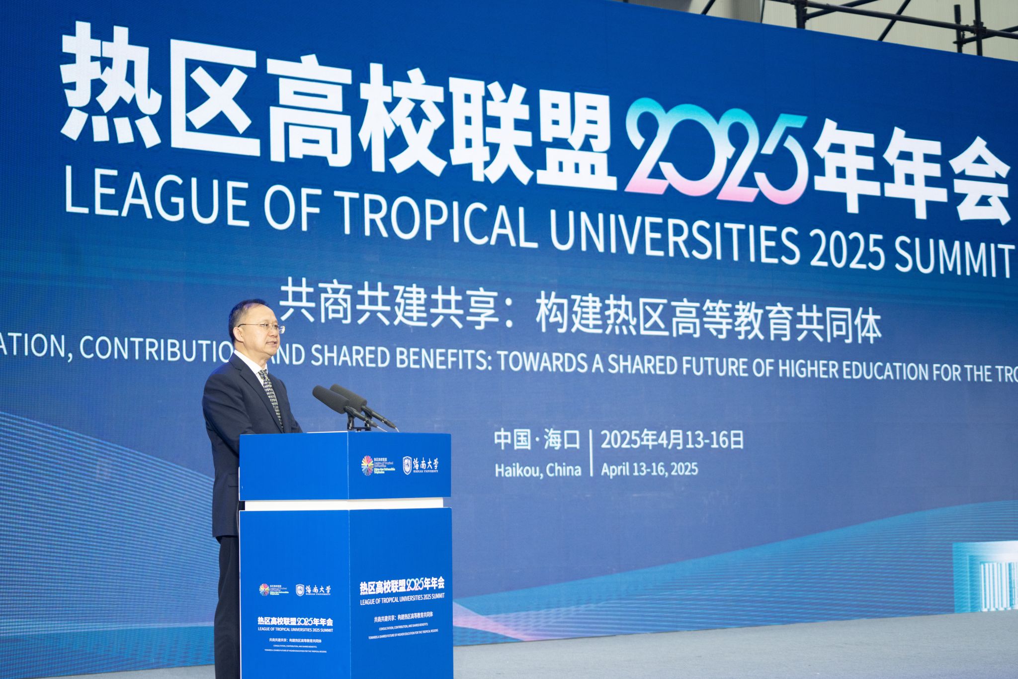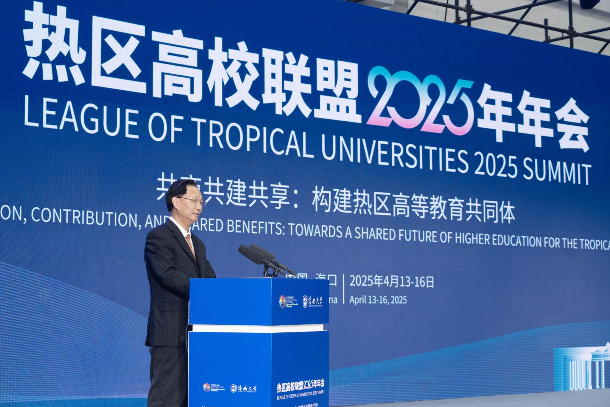 4月14日上午,热区高校联盟2025年年会在海南大学体育馆开幕。这是史忠俊致辞。宣传部 摄