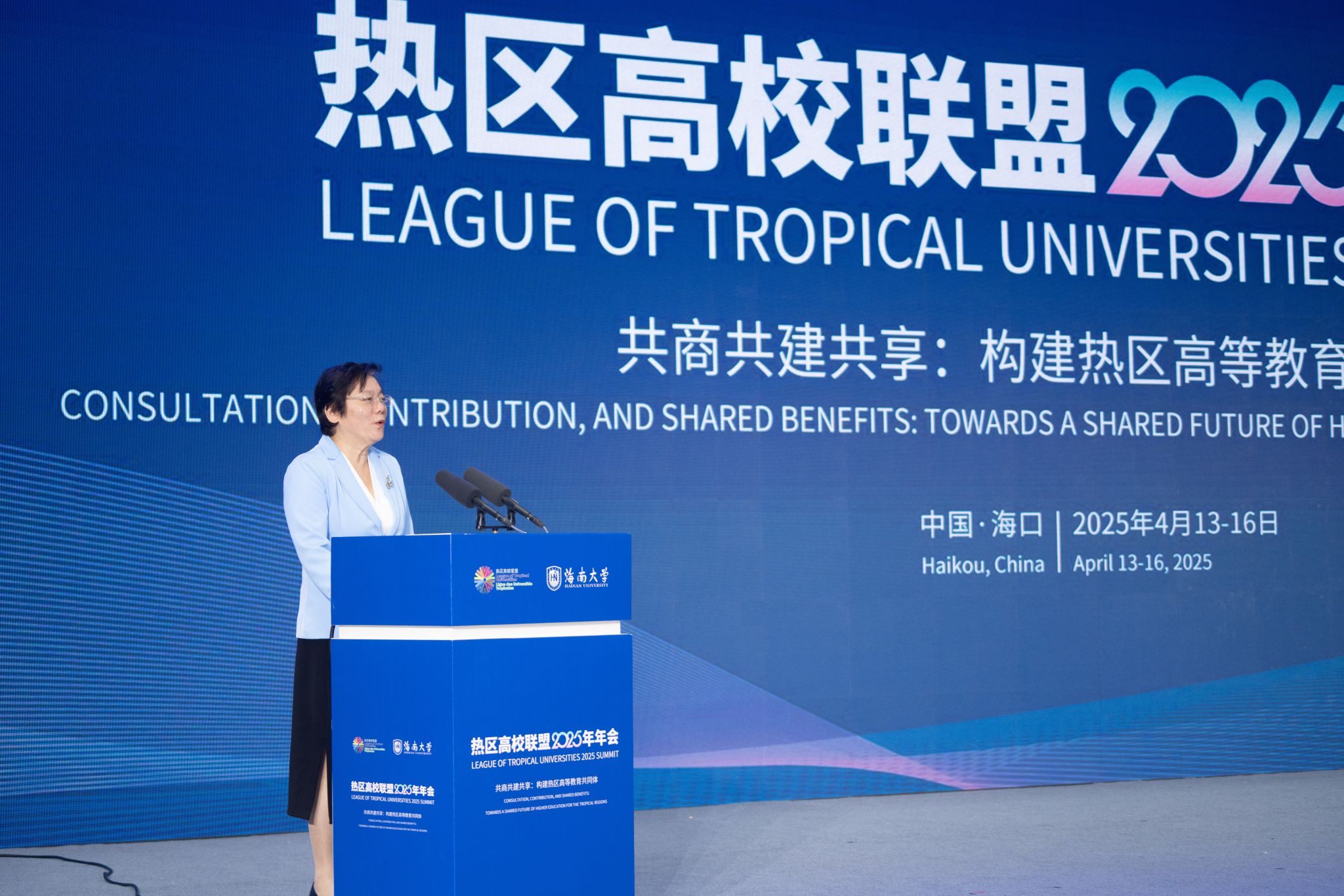 4月14日上午,热区高校联盟2025年年会在海南大学体育馆开幕。这是谢京致辞。宣传部 摄