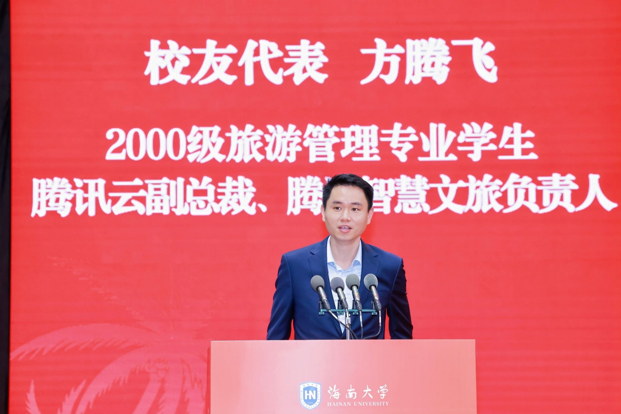 6月18日上午,校友代表方腾飞在海南大学2025年本科生毕业典礼暨学士学位授予仪式上发言。宣传部 摄