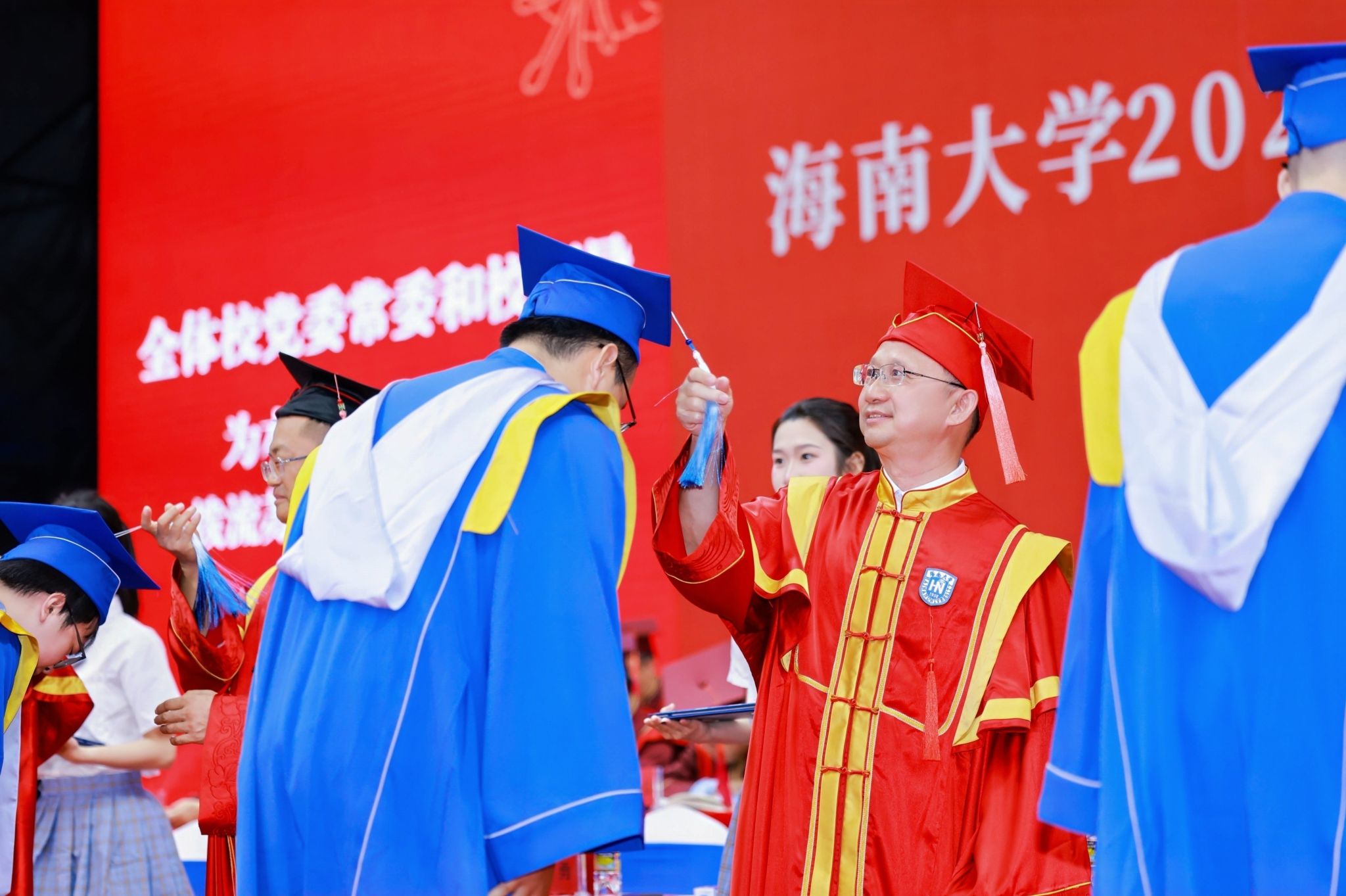 6月18日上午,骆清铭在海南大学2025年本科生毕业典礼暨学士学位授予仪式上为毕业生拨穗正冠。 宣传部 摄