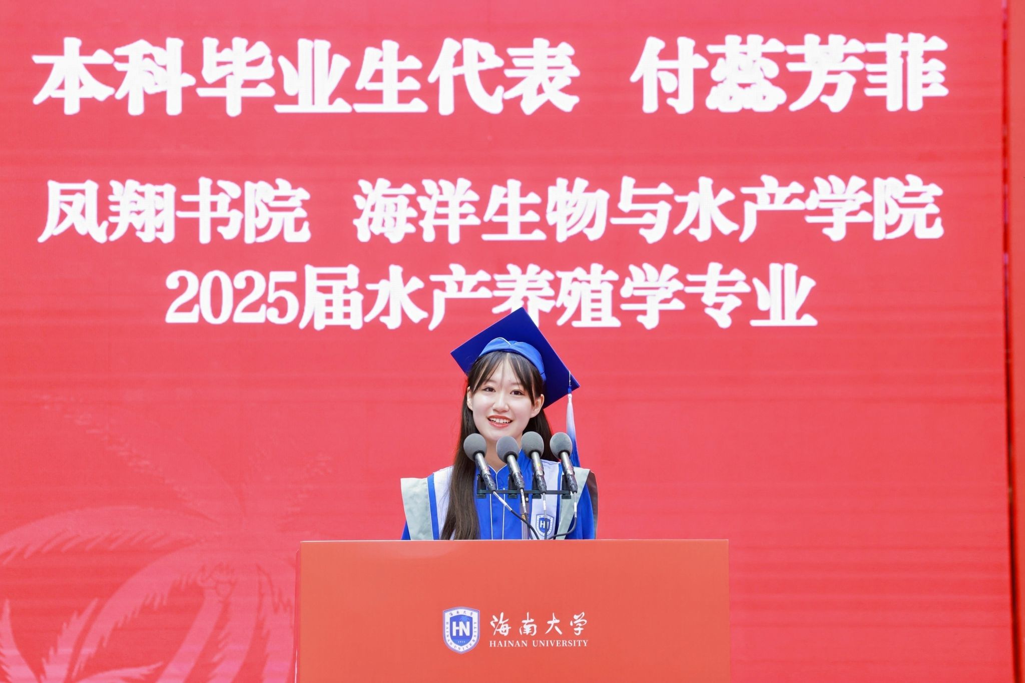 6月18日上午,本科毕业生代表付蕊芳菲在海南大学2025年本科生毕业典礼暨学士学位授予仪式上发言。宣传部 摄