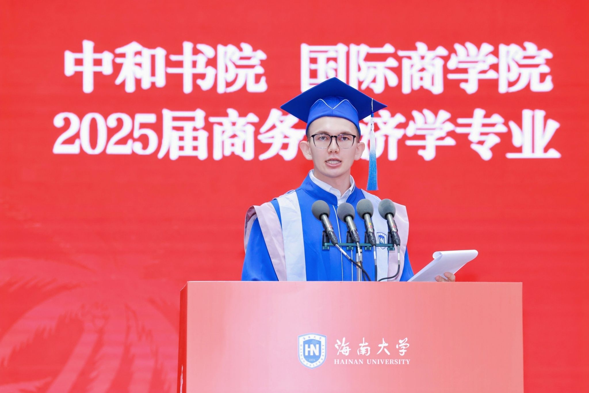 6月18日上午,国际学生代表汉达在海南大学2025年本科生毕业典礼暨学士学位授予仪式上发言。宣传部 摄