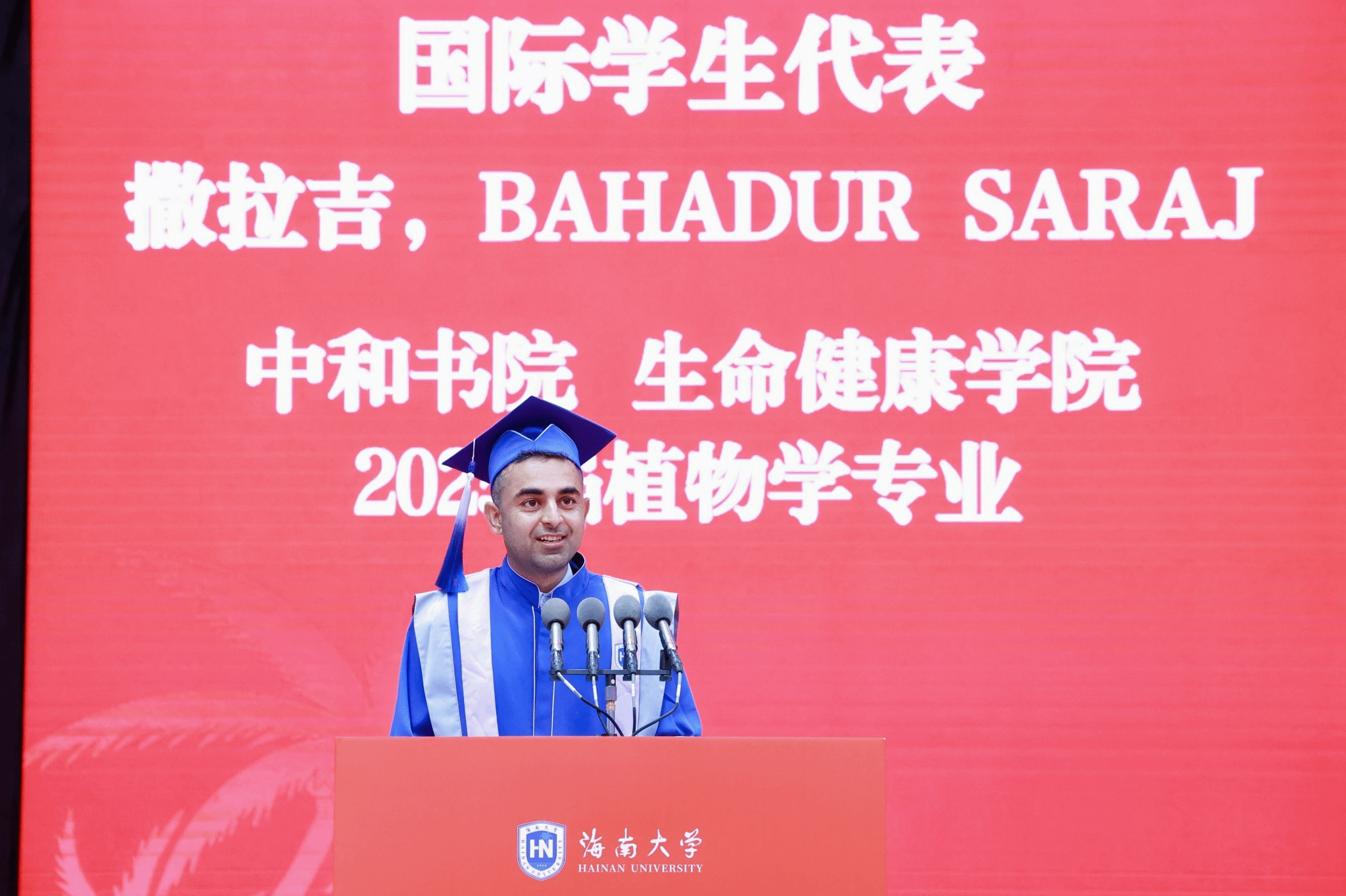 6月19日上午,国际学生代表撒拉吉在海南大学2025年研究生毕业典礼暨硕士、博士学位授予仪式上发言。宣传部 摄