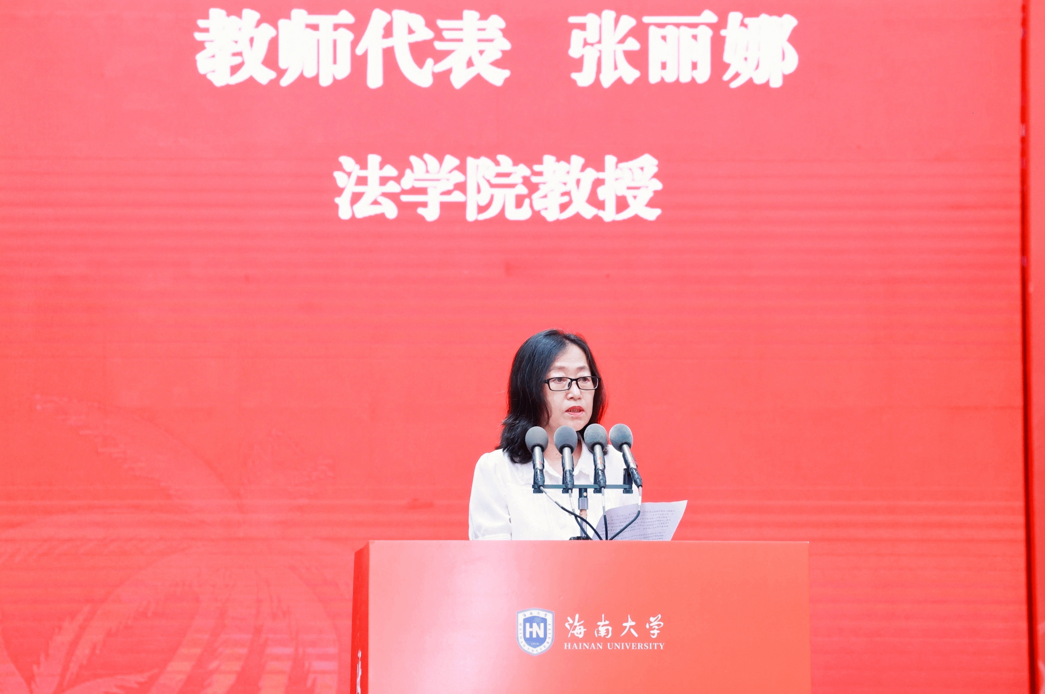 6月19日上午,教师代表张丽娜在海南大学2025年研究生毕业典礼暨硕士、博士学位授予仪式上发言。宣传部 摄