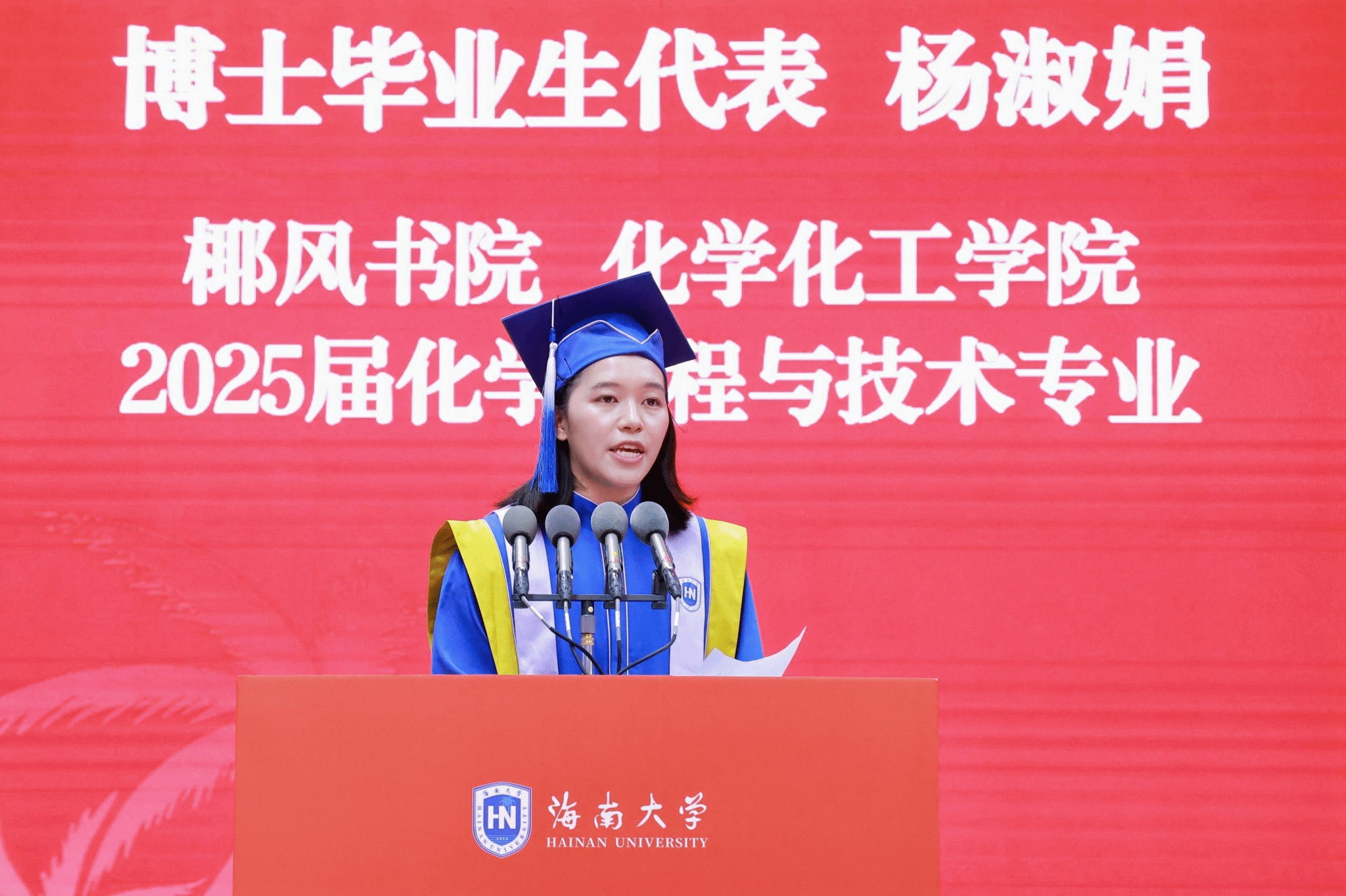 6月19日上午,博士毕业生代表杨淑娟在海南大学2025年研究生毕业典礼暨硕士、博士学位授予仪式上发言。宣传部 摄