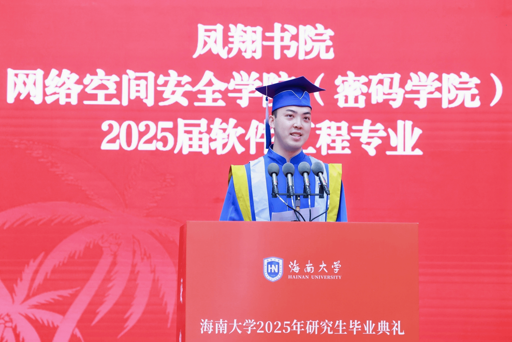 6月19日上午,硕士毕业生代表曲佳富在海南大学2025年研究生毕业典礼暨硕士、博士学位授予仪式上发言。宣传部 摄