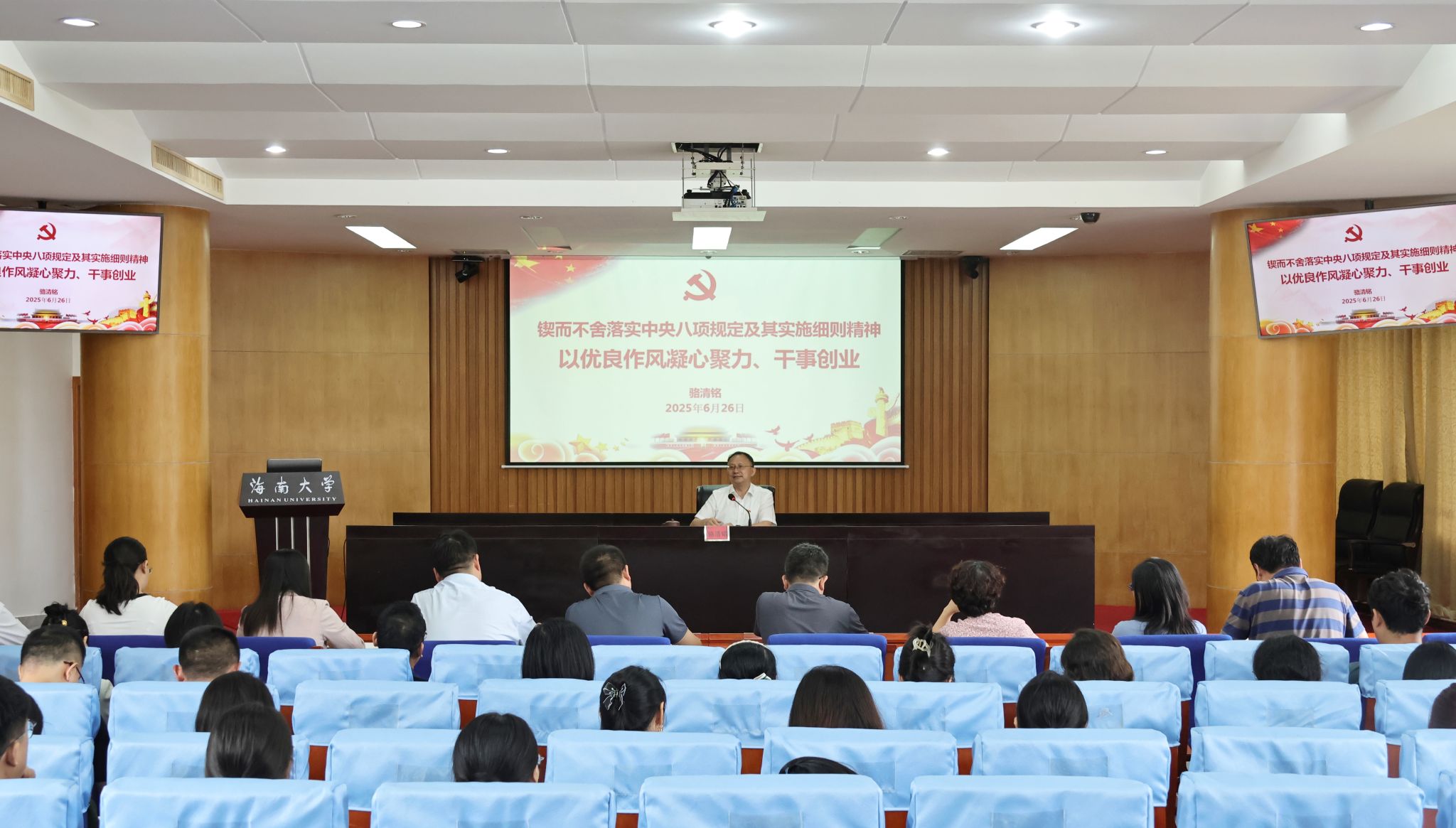 本站讯(记者 郑润泽 邰茜)6月26日上午,海南大学党委副书记、校长骆清铭在办公楼一楼报告厅以《锲而不舍落实中央八项规定及其实施细则精神 以优良作风凝心聚力、干事创业》为题讲授专题党课。